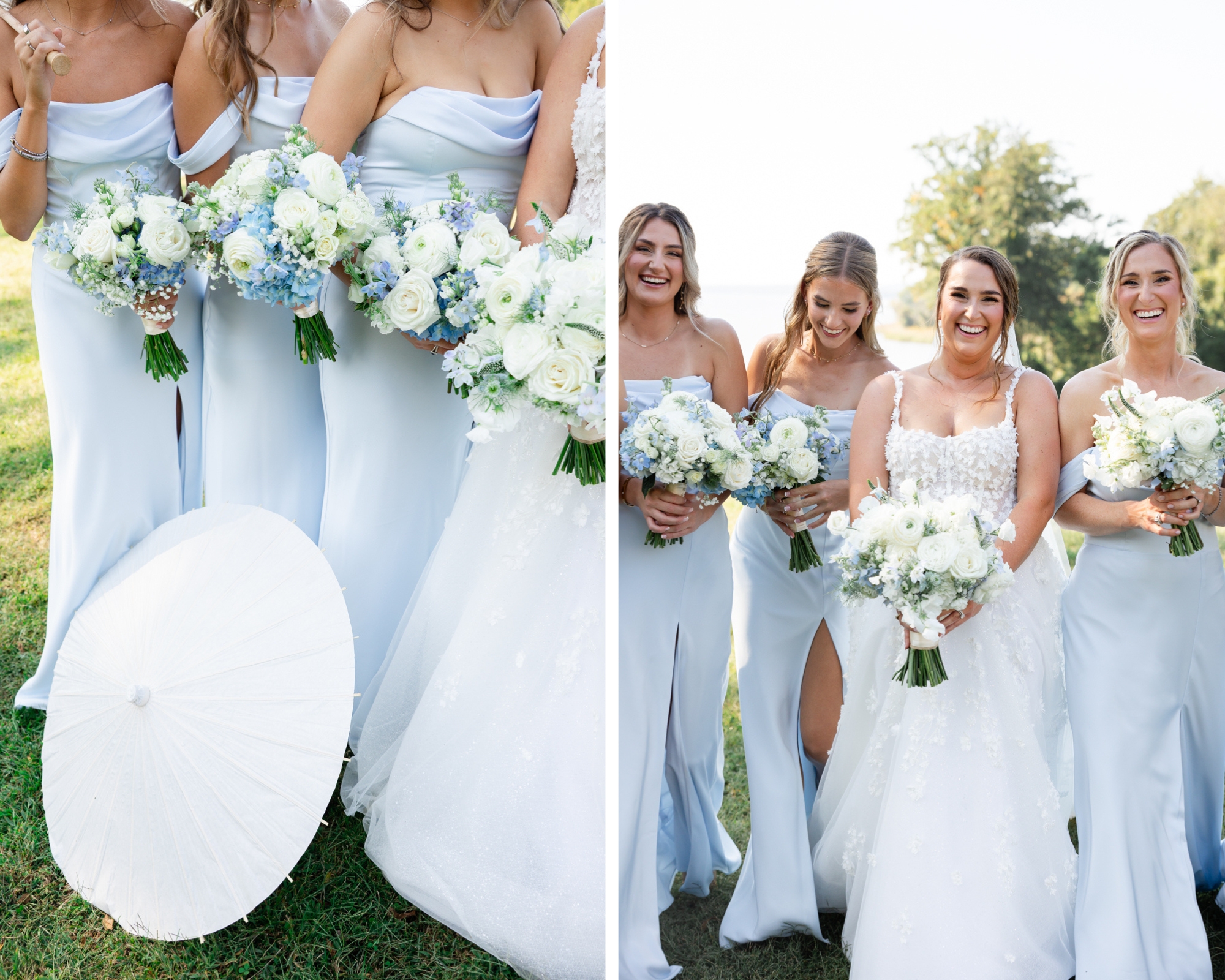 LIGHT BLUE BRIDESMAID DRESSES AND WHITE PARASOLS
