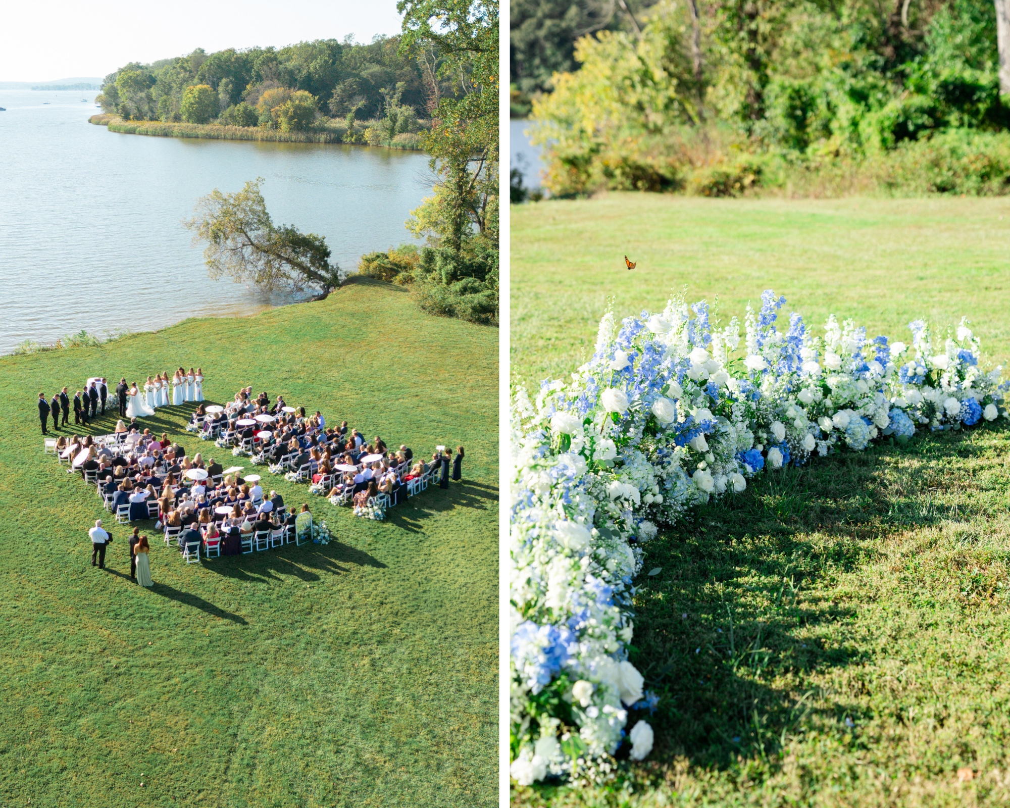 The ceremony took place right on the water, and it was one of the most striking ceremony setups I’ve photographed at Bohemia Manor Farm. Twisted Vine Florals created a blue-and-white floral moment that did not play small. The aisle was lined with florals, and the top of the aisle was filled with ground arrangements that made it look like Maddie and Anthony were standing inside a field of flowers. With Two Rivers Chamber Music playing during the ceremony, the whole space felt romantic and peaceful, even with the summer sun overhead.