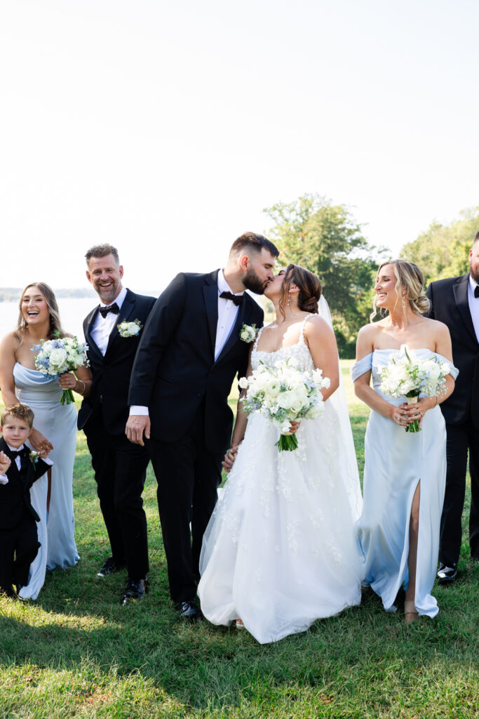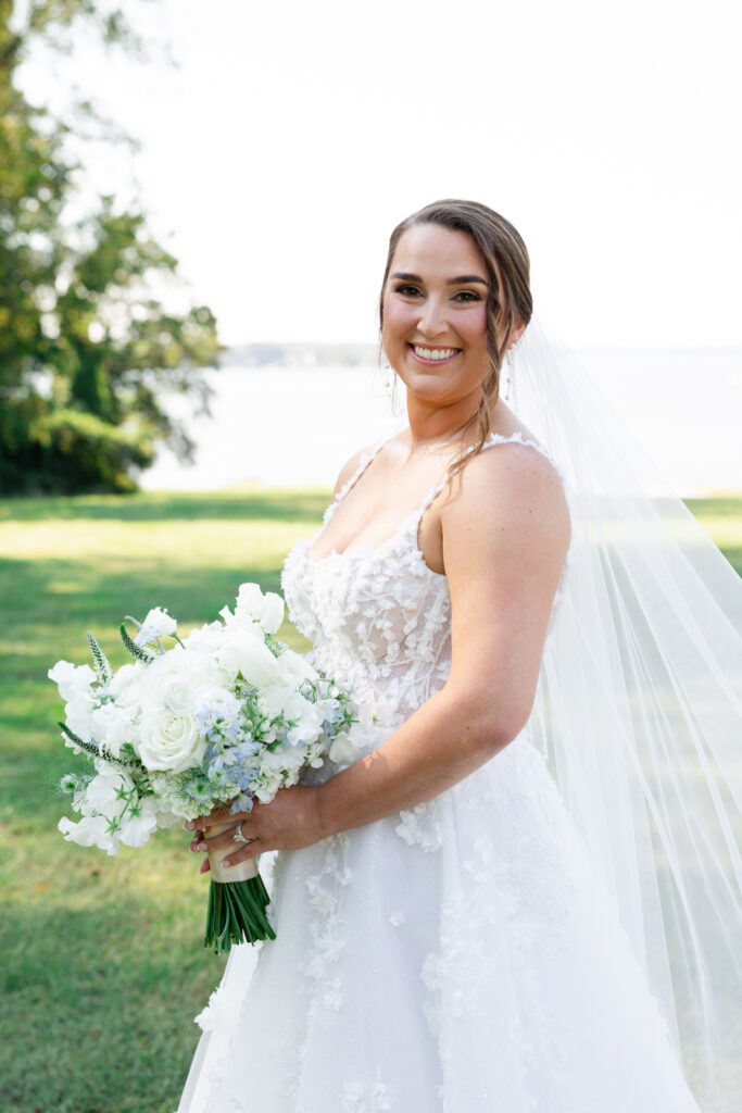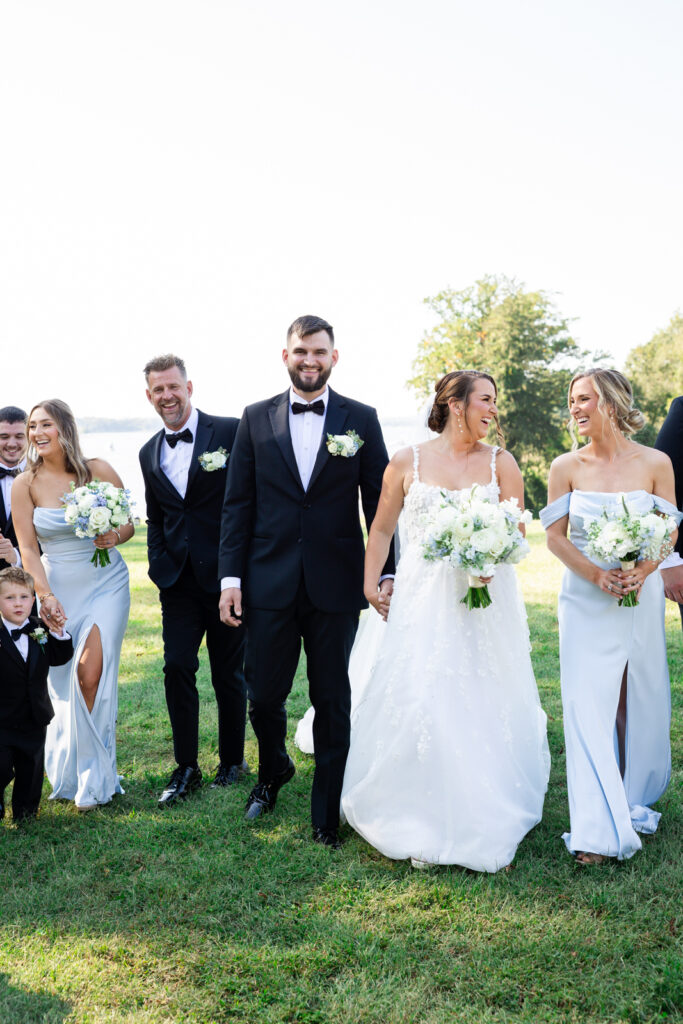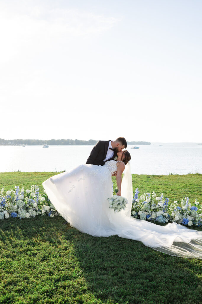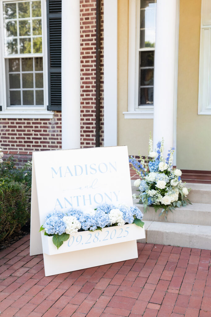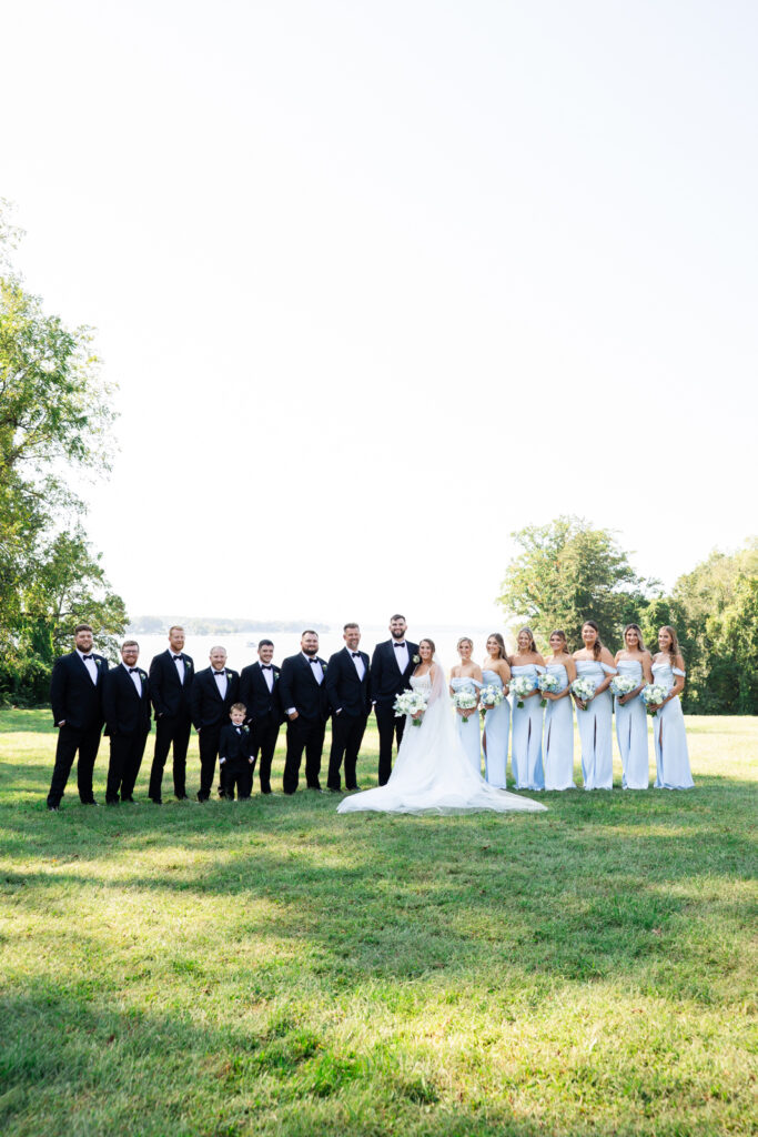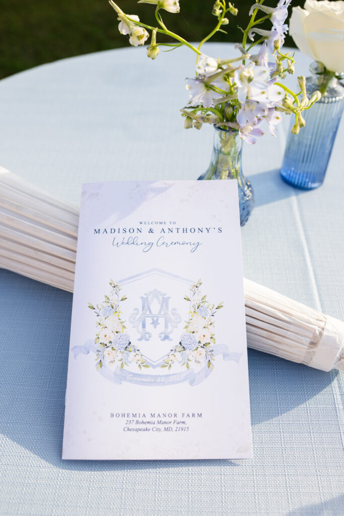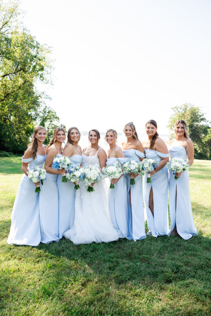 Maddie and Anthony’s Bohemia Manor Farm wedding was the kind of summer celebration that felt effortless, elevated, and full of personality. Set on the Chesapeake Bay, the day flowed from the manor house getting ready spaces to a waterfront ceremony surrounded by florals, then into lawn cocktail hour with an oyster bar and a custom monogram ice sculpture. With light blue bridesmaid dresses, Maddie’s sweeping romantic gown, and endless blue-and-white blooms, every part of the day felt cohesive and thoughtfully designed.