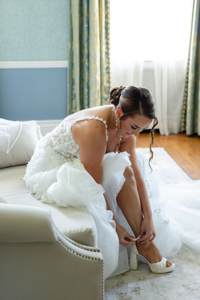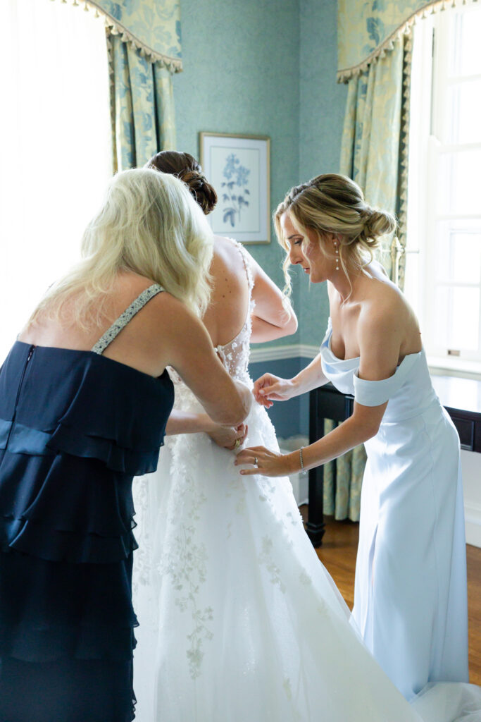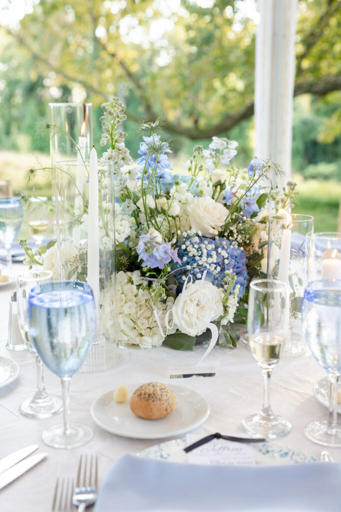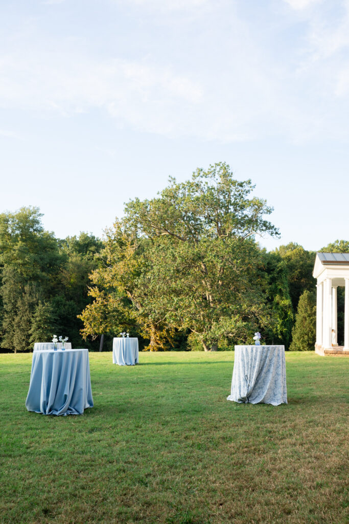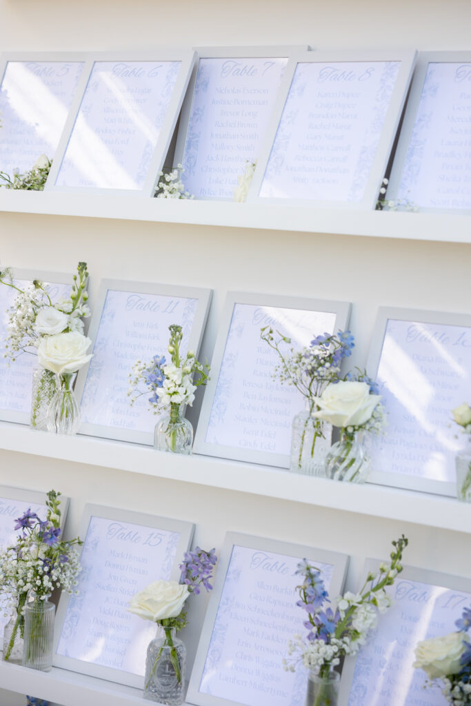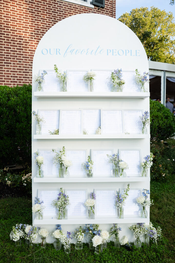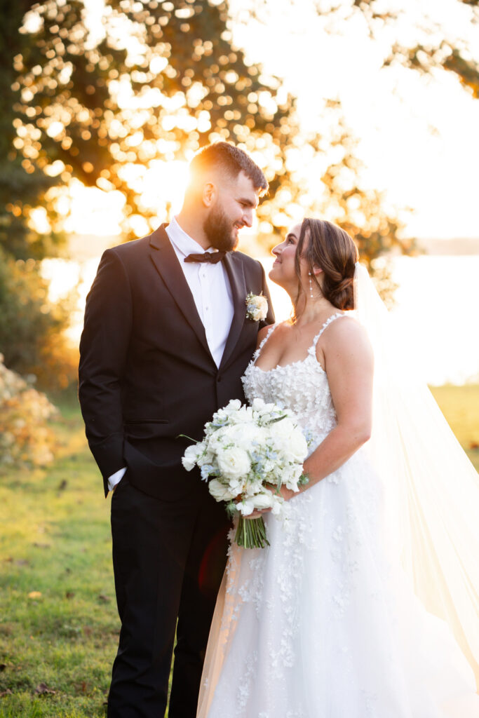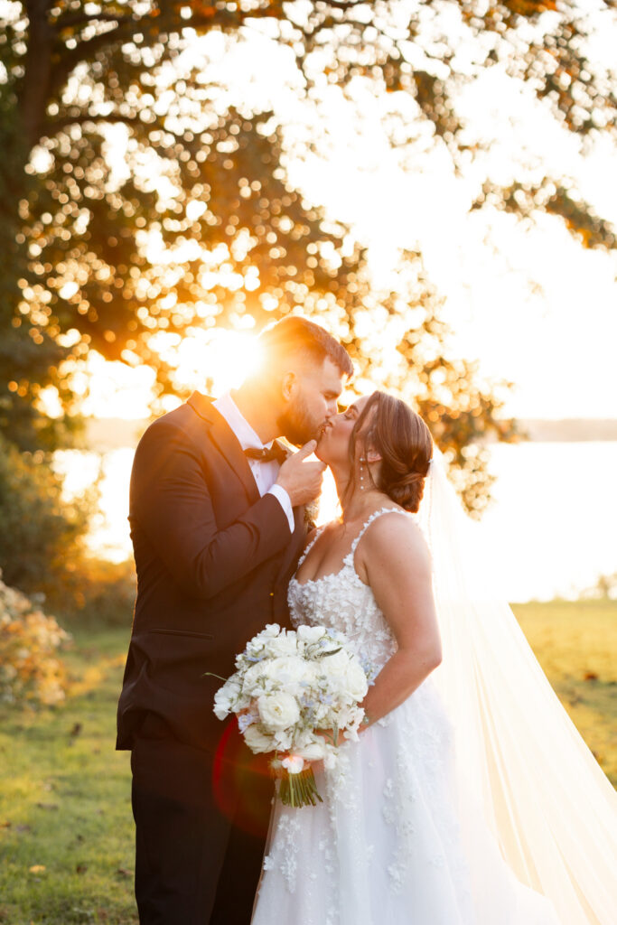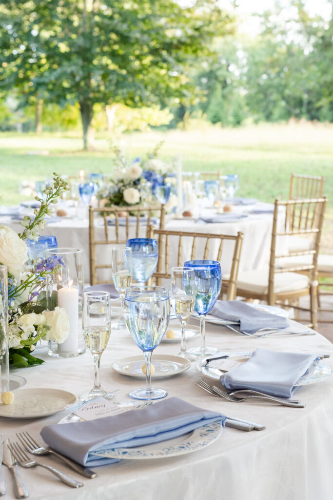 Maddie and Anthony’s Bohemia Manor Farm wedding was the kind of summer celebration that felt effortless, elevated, and full of personality. Set on the Chesapeake Bay, the day flowed from the manor house getting ready spaces to a waterfront ceremony surrounded by florals, then into lawn cocktail hour with an oyster bar and a custom monogram ice sculpture. With light blue bridesmaid dresses, Maddie’s sweeping romantic gown, and endless blue-and-white blooms, every part of the day felt cohesive and thoughtfully designed.