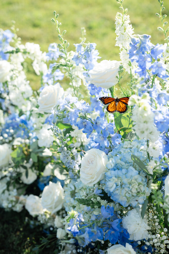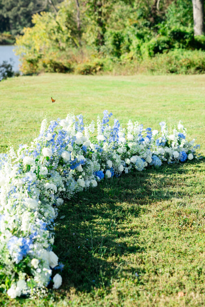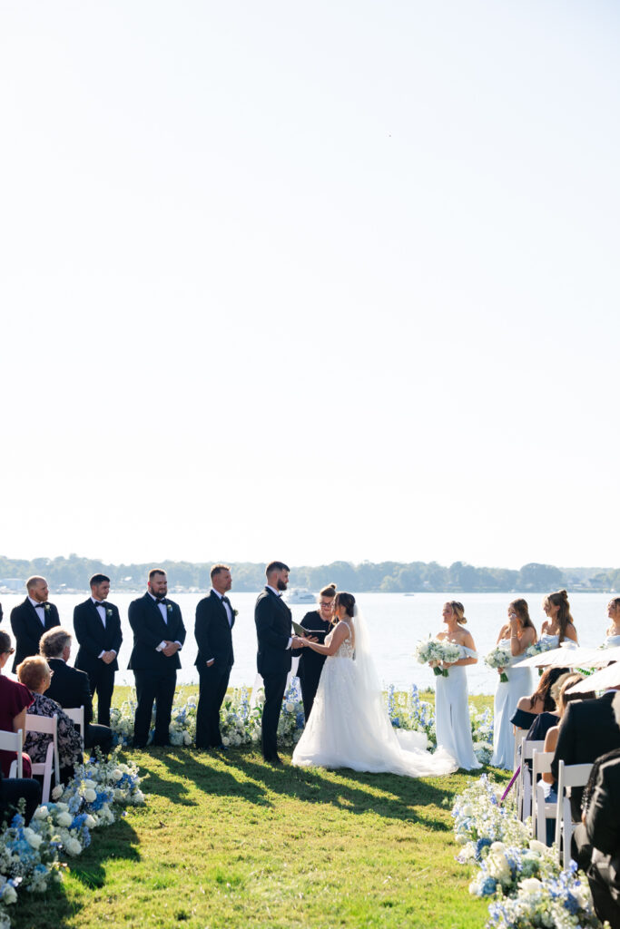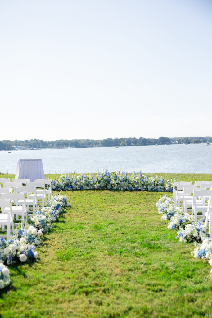 The ceremony took place right on the water, and it was one of the most striking ceremony setups I’ve photographed at Bohemia Manor Farm. Twisted Vine Florals created a blue-and-white floral moment that did not play small. The aisle was lined with florals, and the top of the aisle was filled with ground arrangements that made it look like Maddie and Anthony were standing inside a field of flowers. With Two Rivers Chamber Music playing during the ceremony, the whole space felt romantic and peaceful, even with the summer sun overhead.