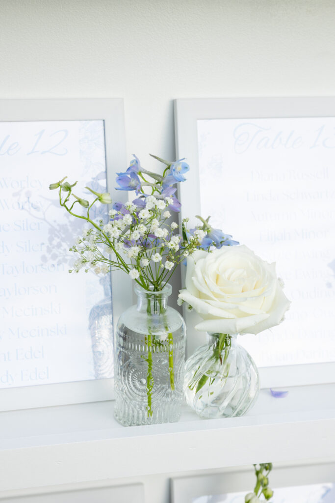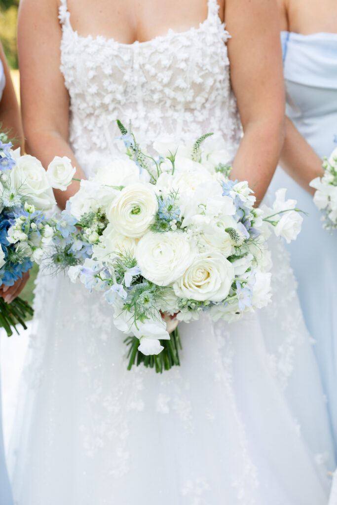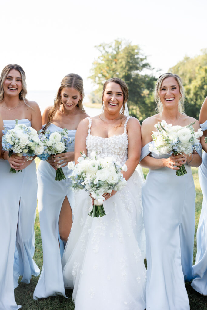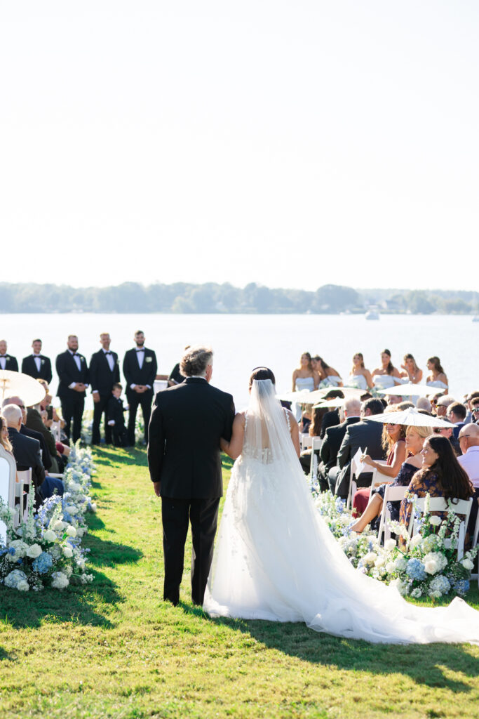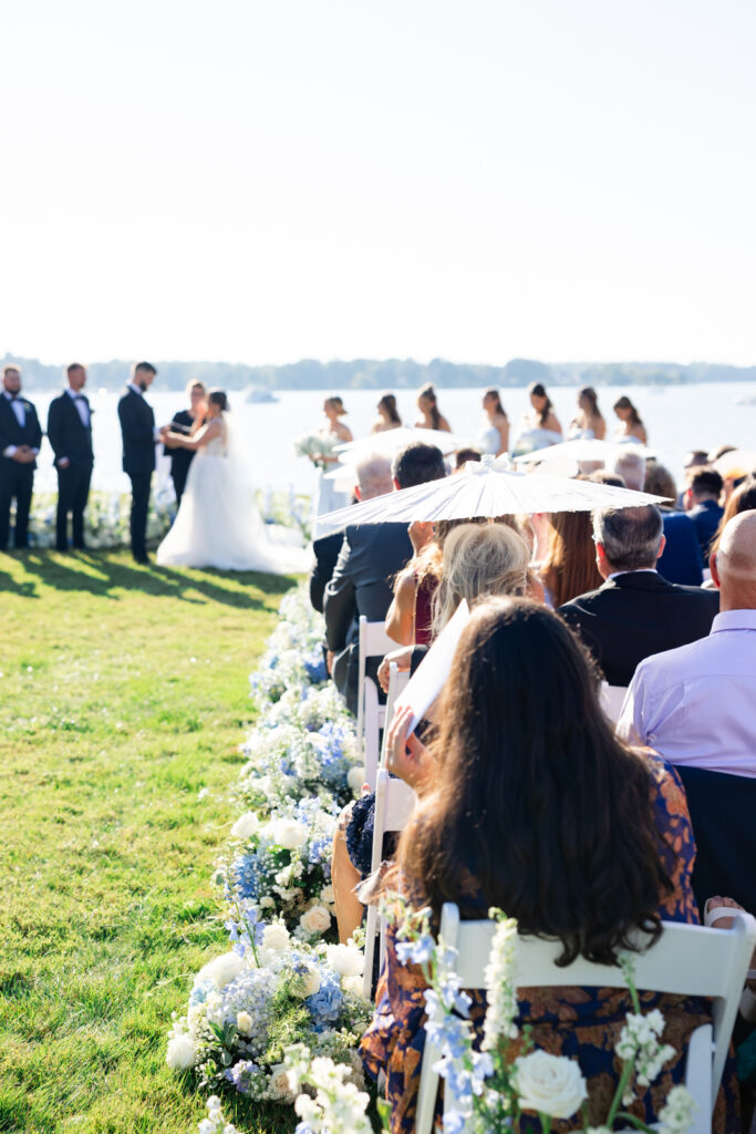 Maddie’s bridesmaids wore light blue dresses with an off-the-shoulder neckline, which was such a clean, flattering choice for a summer waterfront wedding. Guests held white parasols during the ceremony, both practical and honestly very chic in photos. Parasols instantly make an outdoor ceremony feel intentional, and they looked incredible against the bright florals and the water behind the ceremony space.