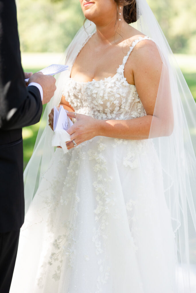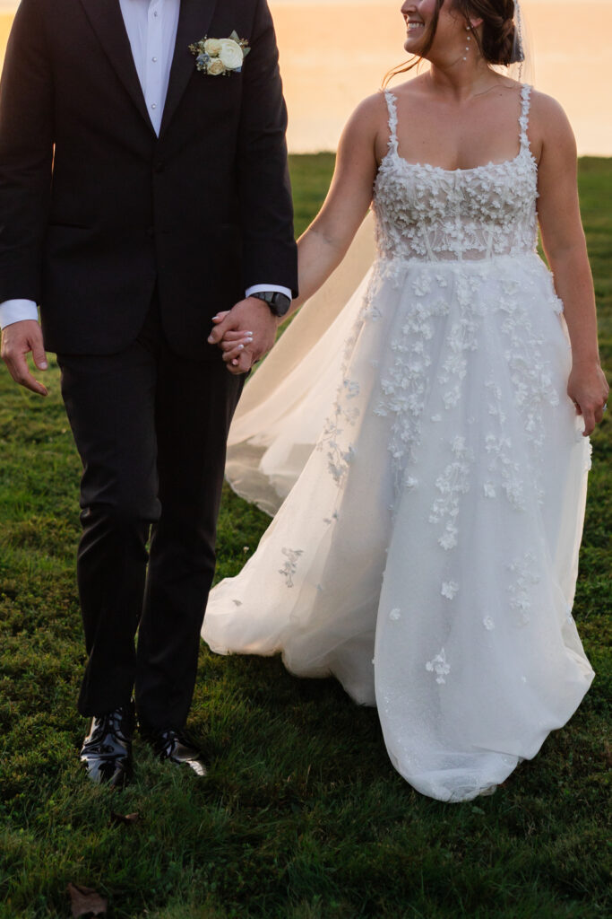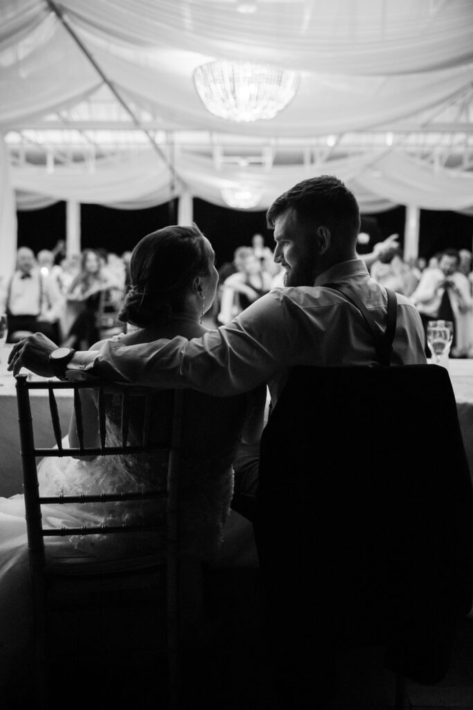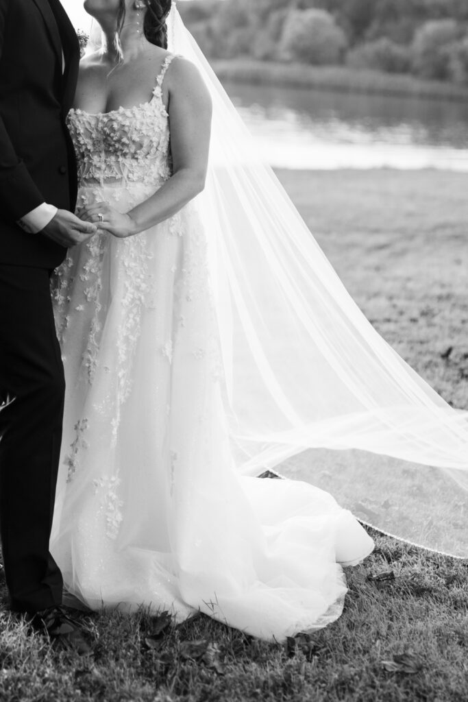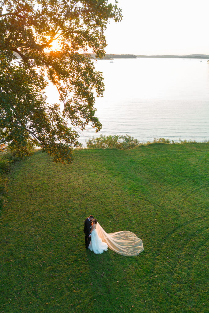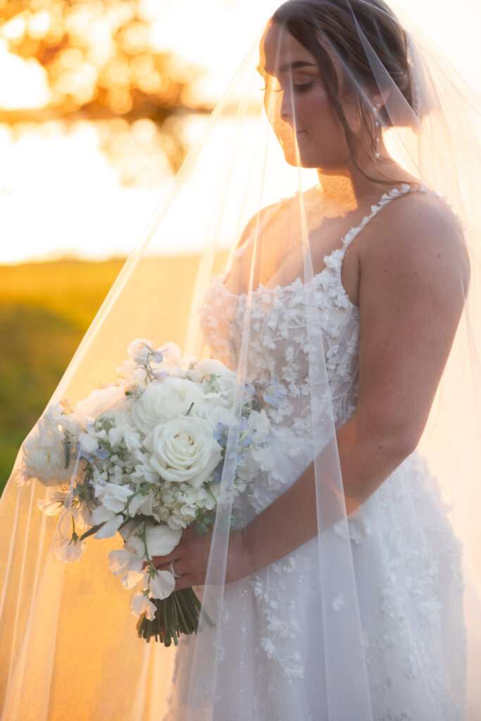 The reception took place under the white sail tent, and once the sun set, it turned into one of those magical summer nights. With draping by On Your Mark Lighting, the space felt soft and romantic, and the open-air tent made it feel like dinner and dancing were happening under the stars. DJ Jimmy T Entertainment kept the party moving, Sweet Somethings Dessert Shop handled the cake, and Just Hitched Films captured the day alongside me.